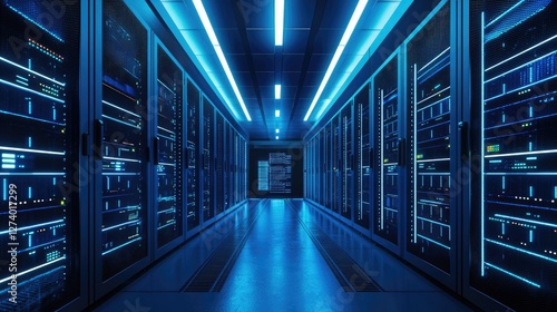 A modern data center with illuminated server racks emitting a blue glow, creating a futuristic and high-tech environment. Ideal for cloud computing, cybersecurity, and digital infrastructure concepts