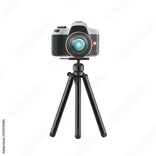 A modern digital camera is mounted on a small tripod, isolated on transparent background