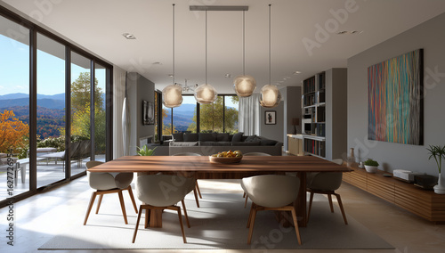 A modern dining room with picturesque views of the mountains and autumn colors. Features: elegant pendant lights, minimalist furniture, a cozy living area, and warm natural tones. Interior design
