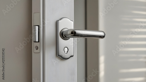 a modern door handle with a keyhole in a silver finish. The handle is on a white door with a subtle light pattern cast upon it. This image focuses on the detail and design of the handle and lock.