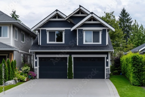 A modern duplex with separate entrances, sleek design, and a spacious driveway for convenient access
