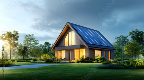 A modern, eco-friendly passive house with a photovoltaic system on the roof and landscaped yard. Solar panels on the gable roof,