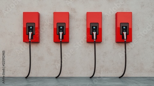 A modern electric vehicle charging station featuring four vibrant red charging units against a minimalist concrete backdrop, symbolizing innovation.