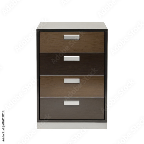 A modern four-drawer wooden chest with a sleek design and alternating dark and light brown wood.