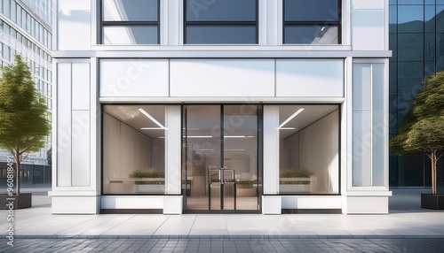 A modern glass building entrance with large windows and minimalist architectural design.