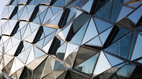 A modern glass building with distinctive, angular designs reflecting the sky, showcasing contemporary architecture and urban aesthetic.