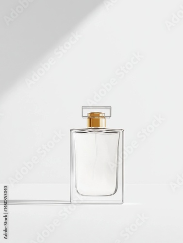 A modern glass perfume bottle with golden cap, centered on a pure white background, soft shadow beneath, high-key lighting, clean minimal style.