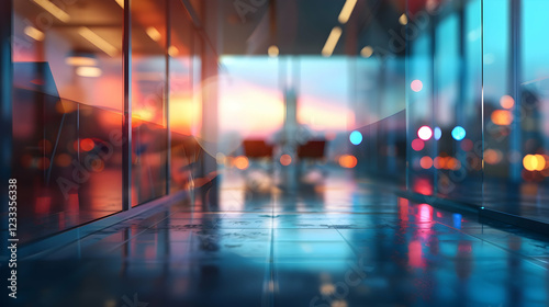 A modern hallway with reflections and a sunset view, creating a serene atmosphere.