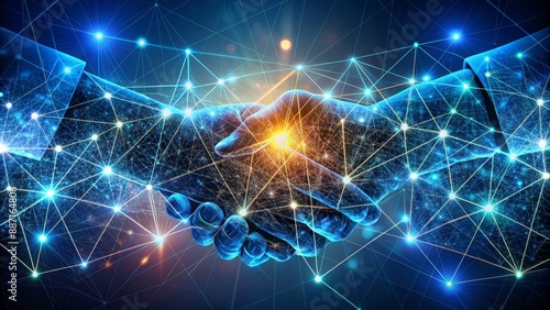 A modern handshake icon surrounded by vibrant digital particles and glowing network connections, symbolizing futuristic partnership, cooperation, and technological unity.