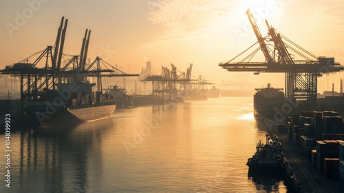 A modern harbor with cranes and ships, the early morning sun casting long shadows over the water and containers, symbolizing the continuous rise of global trade
