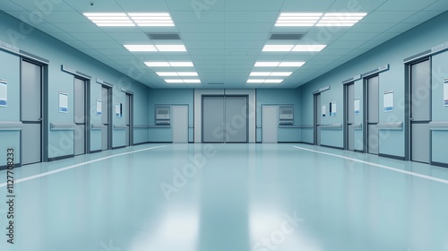 A modern hospital corridor with blue-toned walls and sleek flooring, conveying a sterile environment.