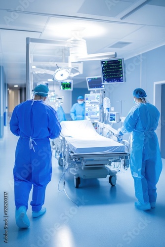 A modern hospital room equipped with ionizing radiation diagnostics shows healthcare professionals in action