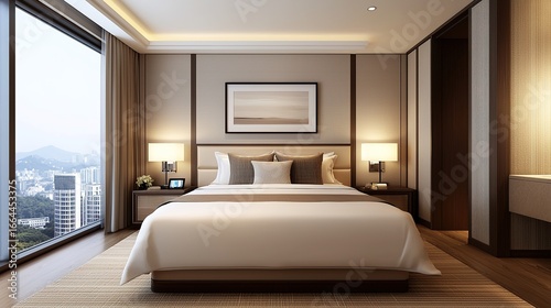 A modern hotel bedroom featuring a large bed, stylish decor, and expansive windows with a city view.