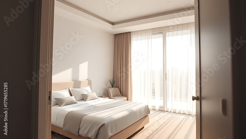 A modern hotel bedroom with morning sunlight and minimalist decor.