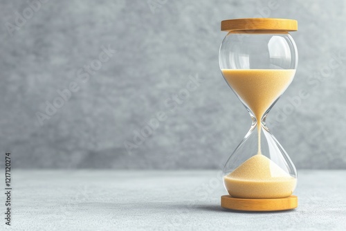 A modern hourglass with flowing sand symbolizes the passage of time, reflecting on life, progress, and change in a minimalist setting.