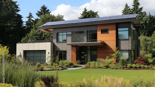 A modern house with solar panels, large windows, and a lush green garden, showcasing contemporary architecture and sustainable features.