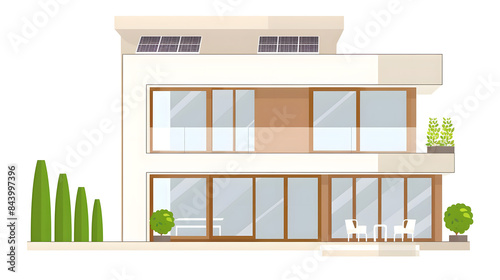 A modern house with solar panels on the roof. space for text. The home has large windows and is surrounded by greenery