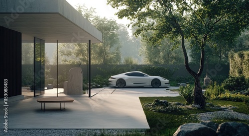 A modern house with white walls, minimalist design and glass windows overlooking the garden, parking space for two cars on one side of garage door