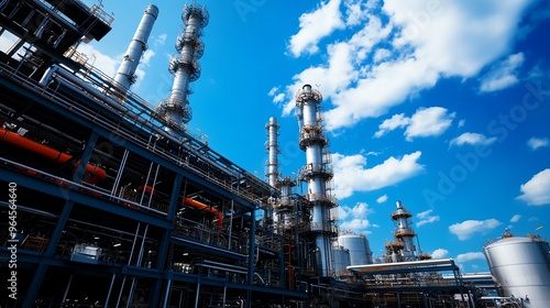A modern industrial facility with tall chimneys and blue sky, showcasing advanced technology and infrastructure.