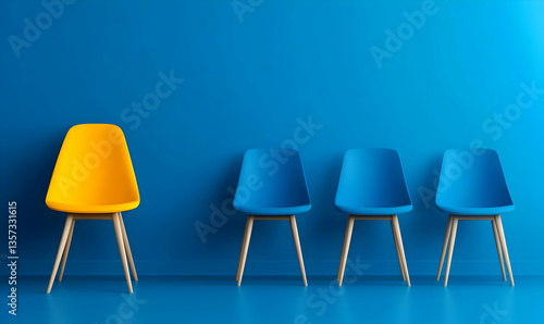 A modern interior featuring colorful chairs against a vibrant blue wall, creating a stylish and energetic atmosphere.