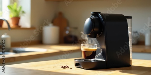 A modern kitchen scene featuring a sleek espresso machine brewing a rich cup of coffee, illuminated by warm sunlight streaming through a nearby window.