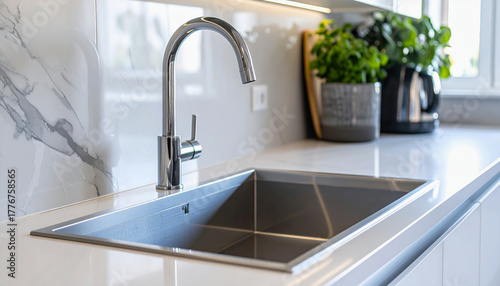A modern kitchen sink with a sleek faucet, surrounded by elegant marble countertops and a vibrant plant for a stylish touch.