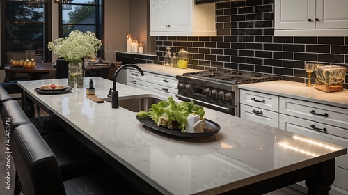 A modern kitchen with ethereal pearl cabinets and starry night quartz countertops