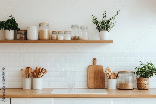 A modern kitchen with wooden shelves, jars, and plants, emphasizing organization and aesthetics.