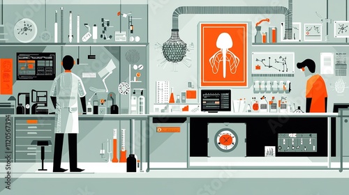 A modern laboratory scene featuring scientists working with various equipment and displays, showcasing research and experimentation.