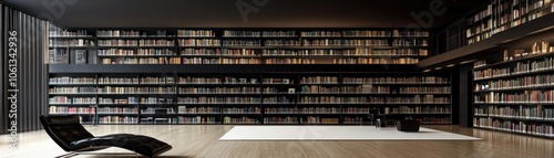 A modern library interior featuring extensive bookshelves and a minimalist reading area.