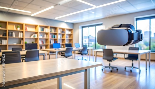 A modern library or study room with desks, chairs, computers, and bookshelves, featuring a floating VR headset for technology-enhanced learning.