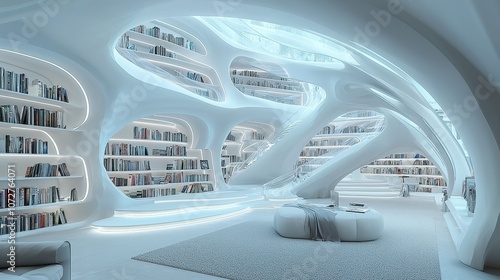 A modern library with interactive digital bookshelves and holographic displays, offering a sleek and immersive reading experience. Visitors can explore books by touching holograms, creating