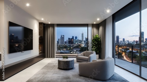 A modern living room featuring a beige sectional sofa and coffee table, positioned in front of large windows offering a city view.
