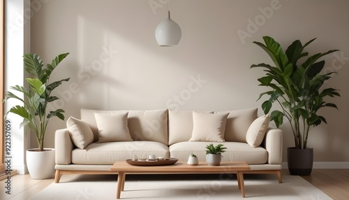 A modern living room with a beige sofa, wooden coffee table, and potted plants in the background.