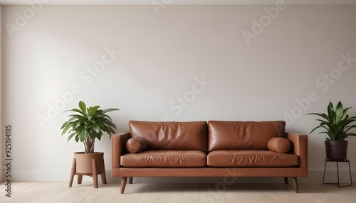 A modern living room with a brown leather sofa, a potted plant, and a wooden side table.