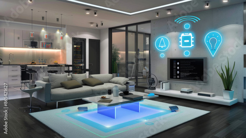 A modern living room with a couch, coffee table, and TV, showcasing smart home technology icons on the wall