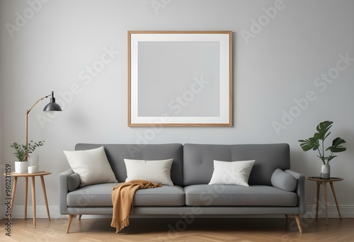 A modern living room with a gray sofa, white walls, and a large empty wooden frame on the wall.