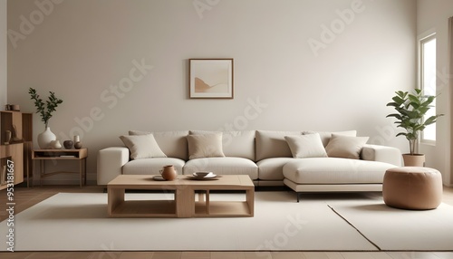 A modern living room with a large beige sofa, wooden coffee table, and minimalist decor.