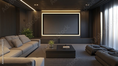 A modern living room with a large screen TV, grey sofa, and a coffee table.