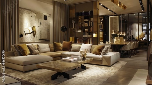 A modern living room with a large sectional sofa and a coffee table. The room is decorated in a neutral color scheme with beige, brown, and white accents