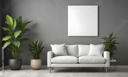 A modern living room with a white sofa, a potted plant, and a blank white canvas on the wall.
