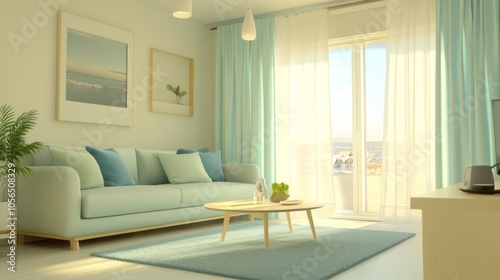 A modern living room with cream walls, a sky blue sofa, and mint green cushions