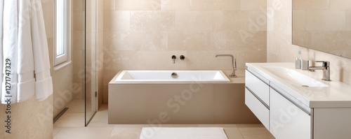 A modern, minimalist bathroom featuring a sleek bathtub, stylish sink, and soft neutral tones, creating a serene and inviting atmosphere.