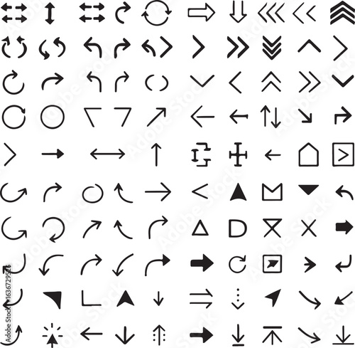 A modern minimalist collection of black arrow icons in various styles and directions, including straight, curved, circular, and chevron designs. Perfect for UI/UX, navigation, infographics, presentati