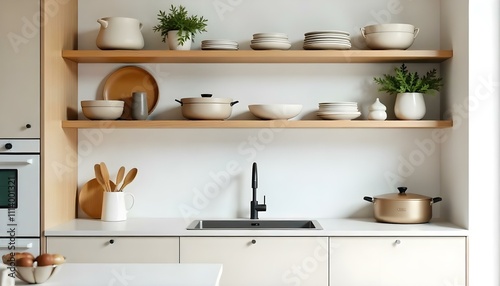 A modern, minimalist kitchen with open shelving displaying various kitchen items and cookware.