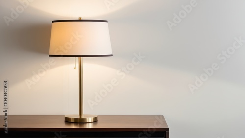 A modern, minimalist lamp illuminates a table with stacked books and a ceramic vase, casting warm light against a neutral wall, creating a cozy ambiance.