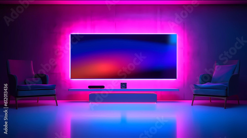 A modern, minimalist living room with RGB+LED backlighting, concept art, generative AI.