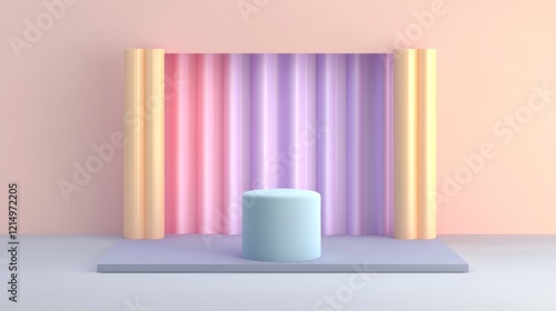 A modern, minimalist scene featuring a pastel-colored backdrop with vertical pleats and a cylindrical pedestal in the foreground.