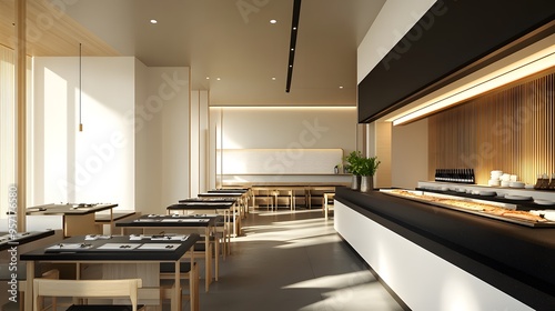 A modern, minimalist sushi restaurant interior with sleek black countertops, white walls, and a sushi bar in the center