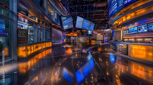 A modern news studio with multiple screens displaying news footage and graphics. The studio is lit with warm orange and blue lighting, creating a vibrant and dynamic atmosphere.